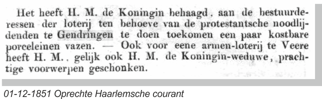 4 maanden later op 1 april 1852 schenkt ze voor de loterij twee rijk vergulde