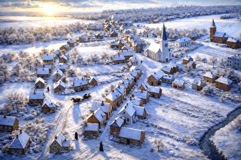 ^ IMPRESSIE van de bewoning van Gendringen in `AI` bewerking na de hand van bovenstaande tekening. Anno 1830 ^