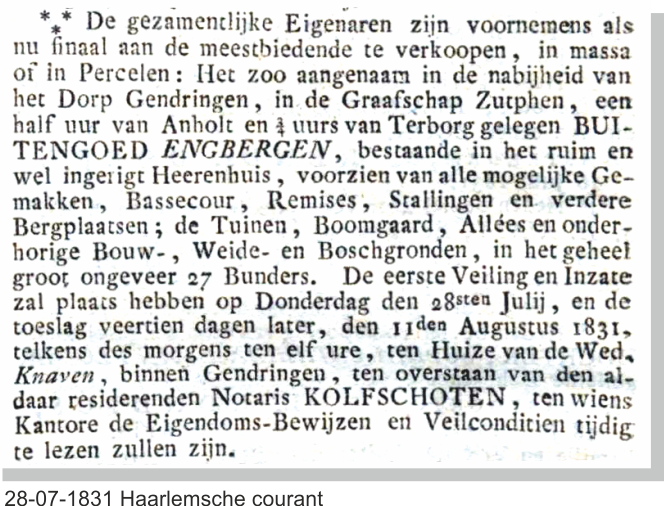 De hoog Adelijk Huis Engbergen werd door de erfgenamen van de machtige familie Hoevel in 1716 al te koop aangeboden