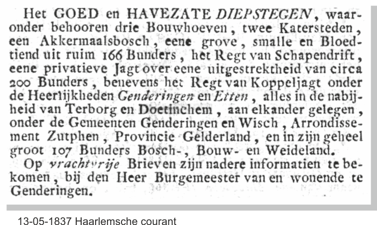 < Op 30 juli werd het Heerenhuis nogmaals per advertentie te koop aangeboden bij een publieke veiling. De voorlopige toeschatting zou op 6 augustus plaats vinden binnen Gendringen en de definitieve toeslag 14 dagen later.