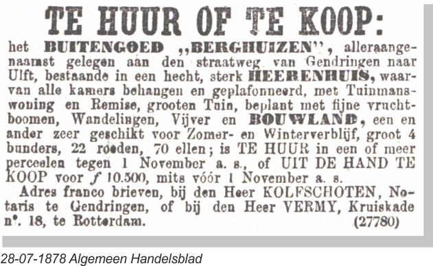 1858: HET BUITENGOED 'BERGHUIS' TE HUUR OF TE KOOP
